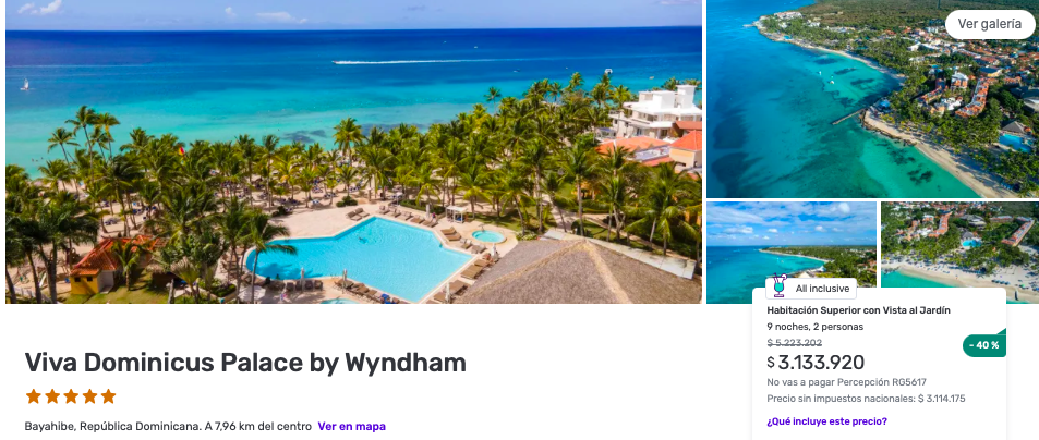 - Viva Dominicus Palace by Wyndham ⭐⭐⭐⭐⭐ desde $ 322.049. Algunas fechas seleccionadas tiene hasta 40% de descuento de la tarifa habitual, tarifa flexible y hay opciones de cuotas.