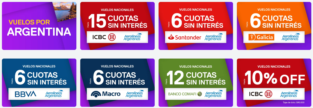 Hay muy buenas opciones de financiación para todo lo que sea vuelos, alojamientos y/o paquetes desde y hacia cualquier destino nacional. Son hasta 15 cuotas sin interés dependiendo del producto y banco.