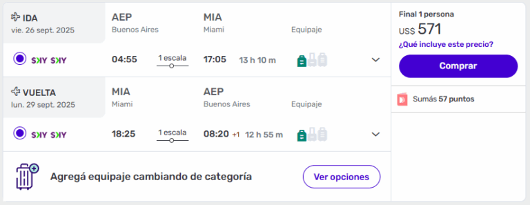 Hay buenas tarifas de vuelos a Miami desde Buenos Aires (Aeroparque) a partir de U$D 571 finales ida y vuelta y tambiƩn opciones a partir de U$D 610 con Equipaje despachado.
