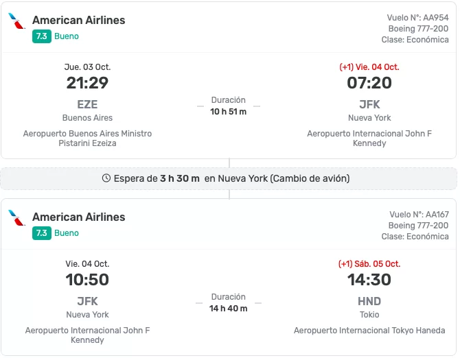 Los pasajeros que vuelen desde Buenos Aires (EZE) pueden conectar con la ruta a Tokio en el Aeropuerto Internacional Dallas/Fort Worth (DFW). American Airlines opera vuelos diarios desde EZE a DFW y también tiene rutas diarias desde DFW a Haneda y Narita (NRT). Ambos, aeropuertos de Tokio.