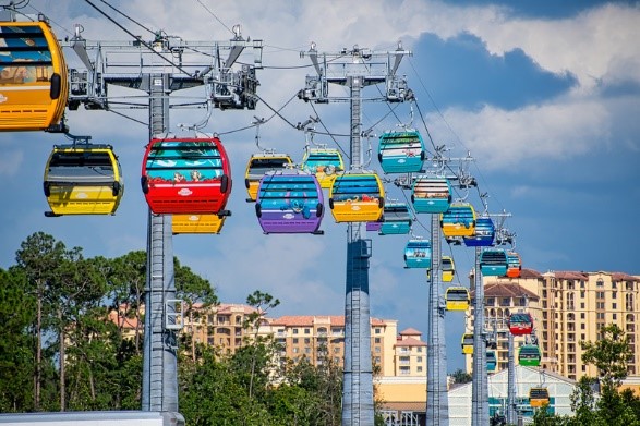 Todos los pasajeros que aborden el teleférico podrán descubrir vistas panorámicas de los estudios de Disney’s Hollywood Studios, incluido el Hollywood Tower Hotel. Y hermosas vistas de Epcot, sobrevolando los alrededores de World Showcase Lagoon y la icónica Spaceship Earth a la distancia.